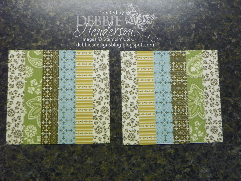 Cut 2 squares of cardstock. I used Whisper White measuring 5" x 5". Cut different patterned paper or colored cardstock in strips. I cut all of mine 3/4" wide and at least 5" long or more: